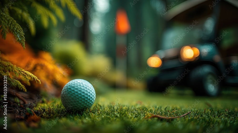 Naklejka do Pokoju Chłopca - Golf ball rests on lush green grass near a golf cart, ready for the next shot on a misty morning. #1803303231