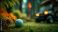 • Golf ball rests on lush green grass near a golf cart, ready for the next shot on a misty morning.