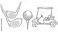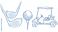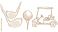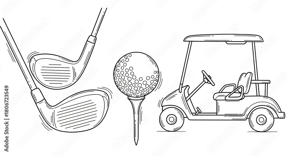 • Illustration of golf equipment: golf clubs, a golf ball on a tee, and a golf cart.