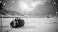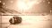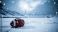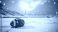 • American football resting on snowcovered field inside empty stadium during heavy snowfall with dramatic winter sky