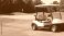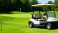 • Golf cart parked on a lush green golf course with a flag in the distance under a bright sunny sky showcasing the beauty of the sport and the serene landscape of the golf course environment