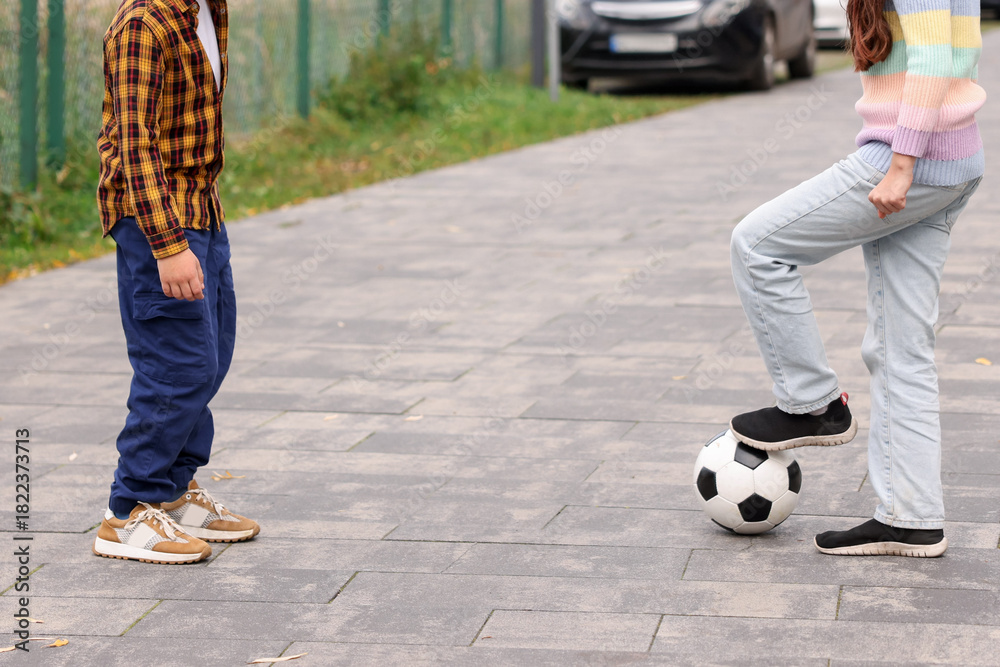 Naklejka do Pokoju Chłopca - Little girl and boy playing with ball on pavement outdoors, closeup. Children in danger #1822373713