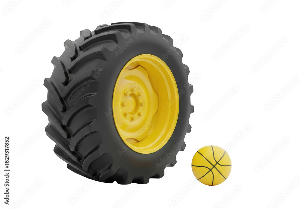 • Tractor tire with yellow basketball isolated on transparent background
