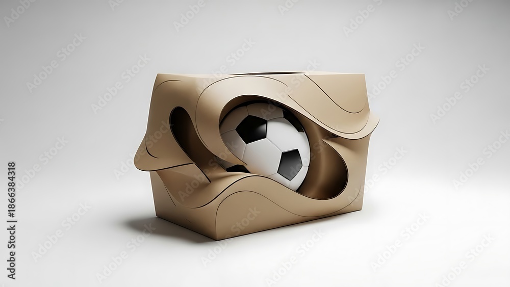 • Conceptual Football Delivery: 3D Soccer Ball Peeking Out of an Abstract, Beige Cardboard Packaging Box with Modern Flowing Design.