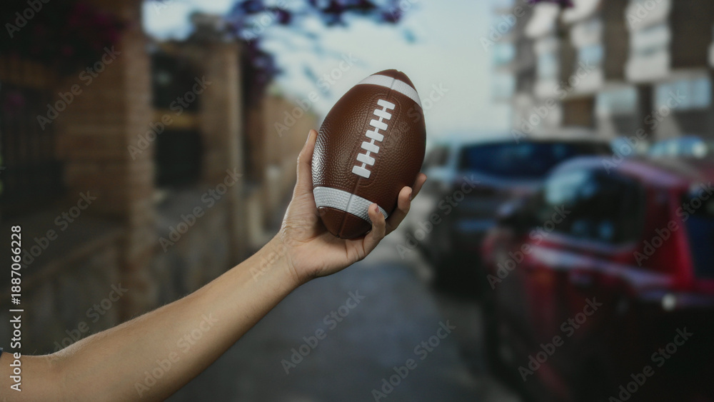 • Man holding football on city street with cars and buildings in the background, showcasing a sporting theme in an urban environment with a focus on leisure and sports.