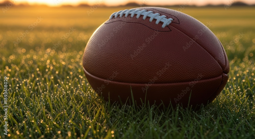 Naklejka do Pokoju Chłopca - American football resting on green grass field at sunset #1893618029