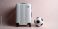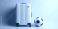 Naklejka do Pokoju Chłopca - Minimalist studio shot of a white travel suitcase standing next to a soccer ball on a light pink... #1972801617