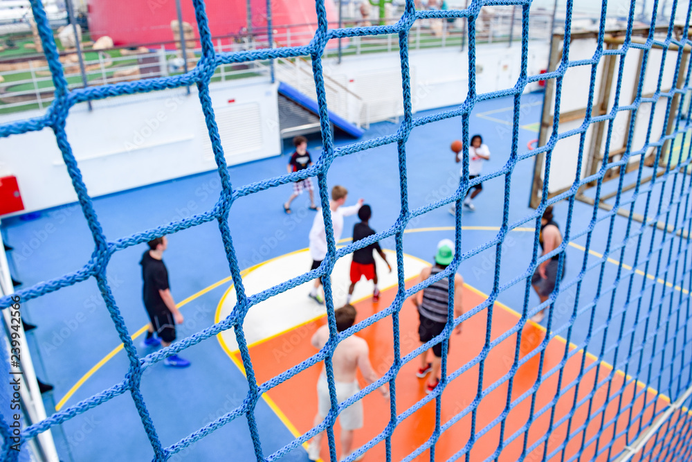Naklejka do Pokoju Chłopca - Netting around basketball court and a game in session, onboard a cruise ship #239942566