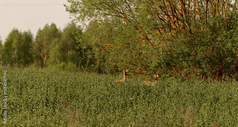 Naklejka do Pokoju Dziewczynki - Dzikie zwierzęta w naturze, samiec sarny i samica stojące na polu rzepaku, zwierzyna łowna,... #1014547190