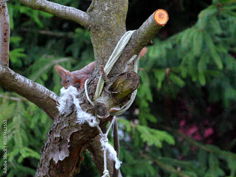 Naklejka do Pokoju Dziewczynki - Wiewiórka przegryza linę na placu zabaw i wyszarpuje z niej puch zbierając go na wyściółkę gniazda. #1507452557