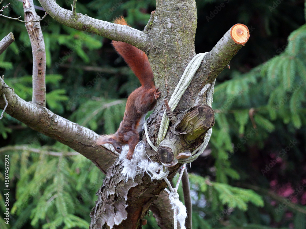 Naklejka do Pokoju Dziewczynki - Wiewiórka przegryza linę na placu zabaw i wyszarpuje z niej puch zbierając go na wyściółkę gniazda. #1507457392