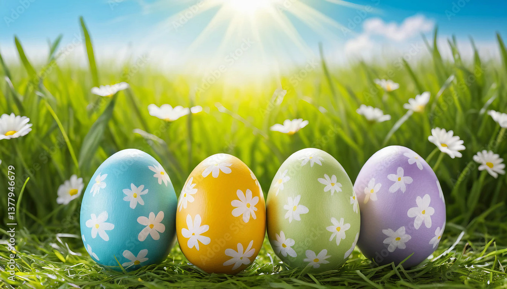 Naklejka do Salonu - Cztery malowane pisanki Wielkanocne w wiosenny dzień z zieloną łąką i stokrotkami, jasnym... #1377946679