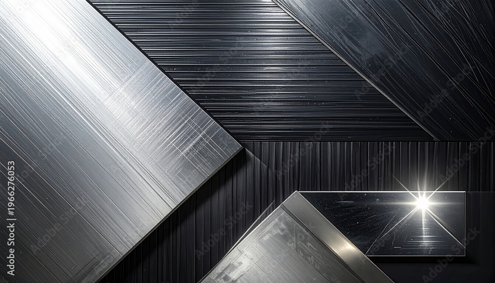 • Abstrakcyjne tło z geometrycznymi panelami ze szczotkowanego metalu, srebra i grafitu.