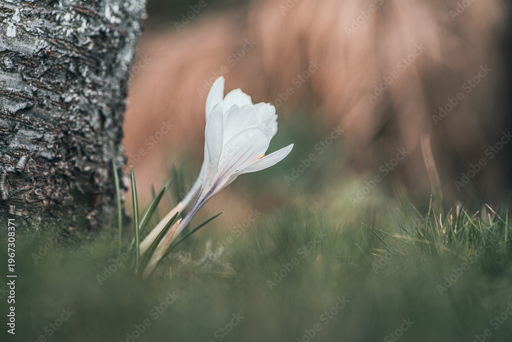 Naklejka do Salonu - Delikatny biały krokus rosnący przy pniu drzewa na wiosennej polanie. Artystyczne ujęcie makro z... #1967308371