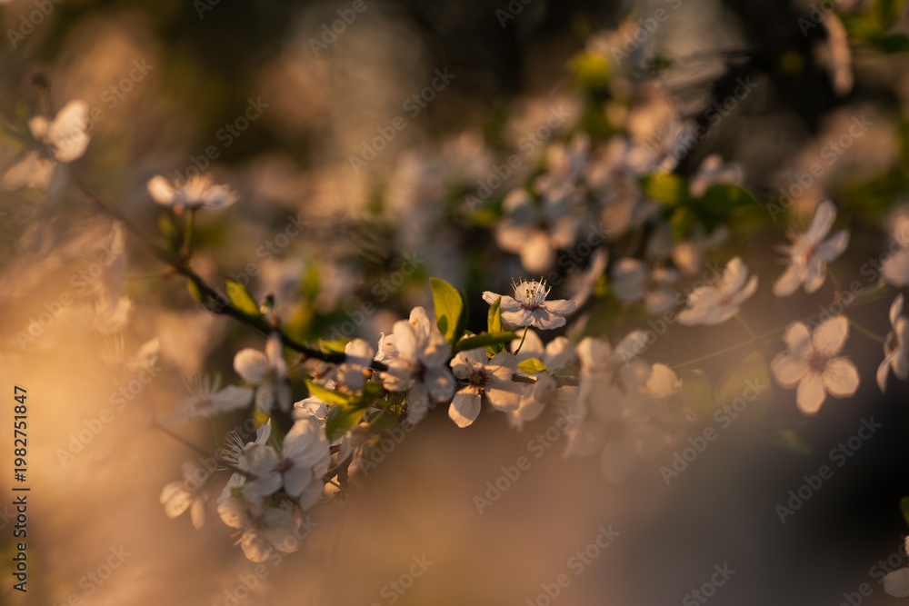 Naklejka do Salonu - Kwitnąca śliwa w wiosennym parku – białe kwiaty na drzewie w miękkim świetle i rozmyciu tła #1982751847