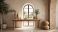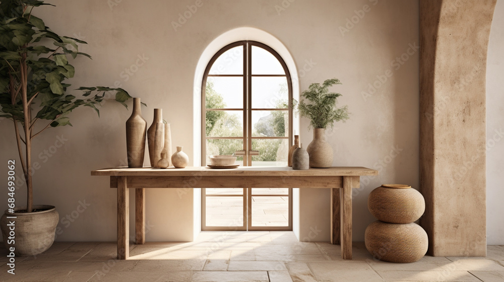 Naklejka do Salonu - Stół z glinianymi naczyniami na tle okna w pastelowych kolorach #684693062