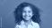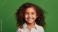 • Portret studyjny dziewczynki uśmiechniętej na zielonym tle z dużą ilością wolnego tła