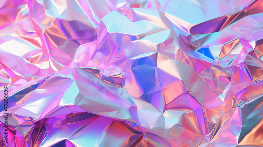 • Holograficzna tapeta opalowa - technika i sztuka. Różowe, fioletowe i niebieskie odcienie tła folii o nieregularnych kształtach geometrycznych.