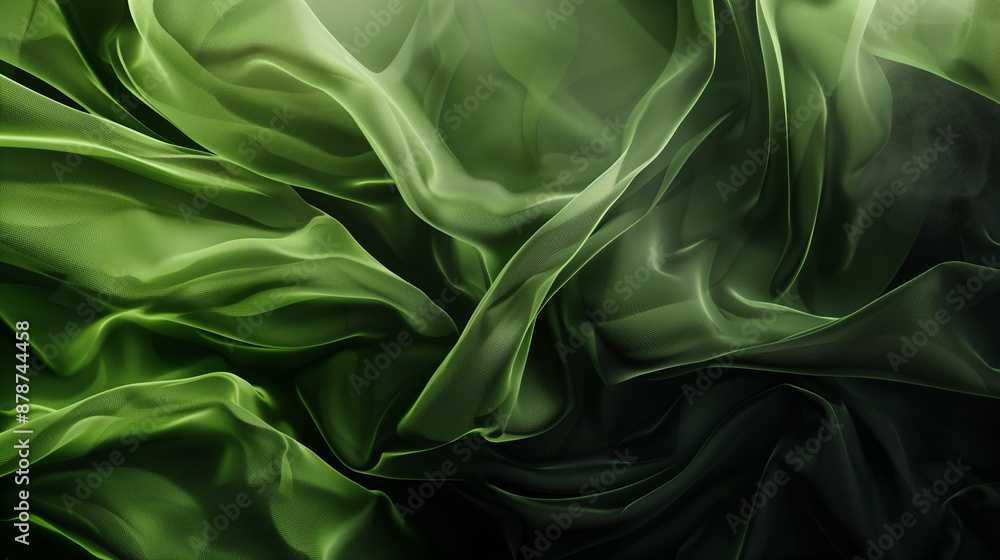 Naklejka do Salonu - Zielona tkanina - butelkowy kolor tła. Materiał tiul ułożony w nieregularne zagięcia. Szablon... #878744458