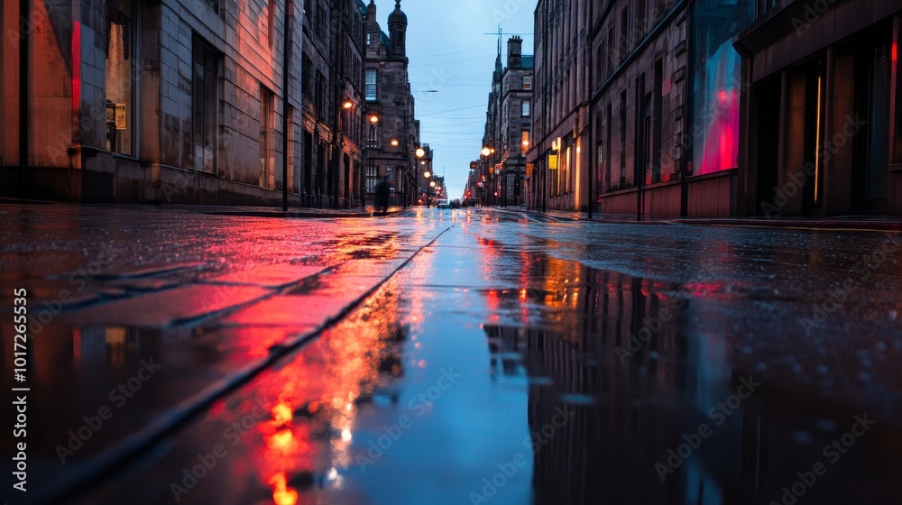 Naklejka do Sypialni - Atmospheric photo of empty Glasgow street at dawn with overcast sky and rain, captured from a low... #1017265535