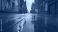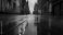 • Atmospheric photo of empty Glasgow street at dawn with overcast sky and rain, captured from a low angle.