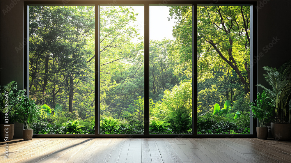 Naklejka do Sypialni - Naturalny pejzaż leśny widziany z wnętrza przez okno, z gęstymi, zielonymi drzewami i ciepłym... #1085285467