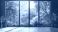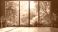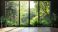 • Naturalny pejzaż leśny widziany z wnętrza przez okno, z gęstymi, zielonymi drzewami i ciepłym światłem rozświetlającym scenerię.