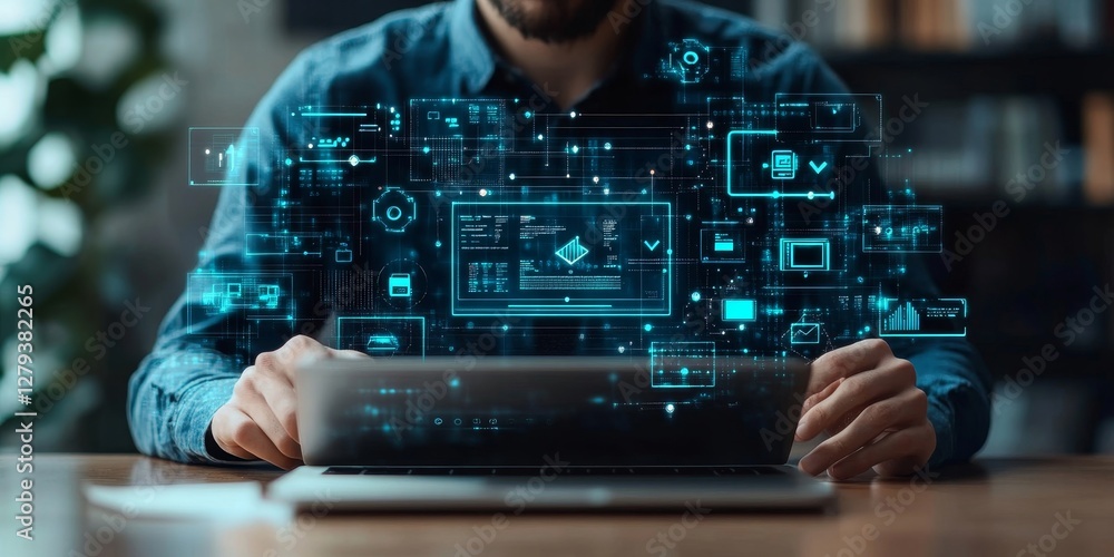Naklejka do Sypialni - Software developer working on laptop, surrounded by icons representing concept of Minimum Viable... #1279382265