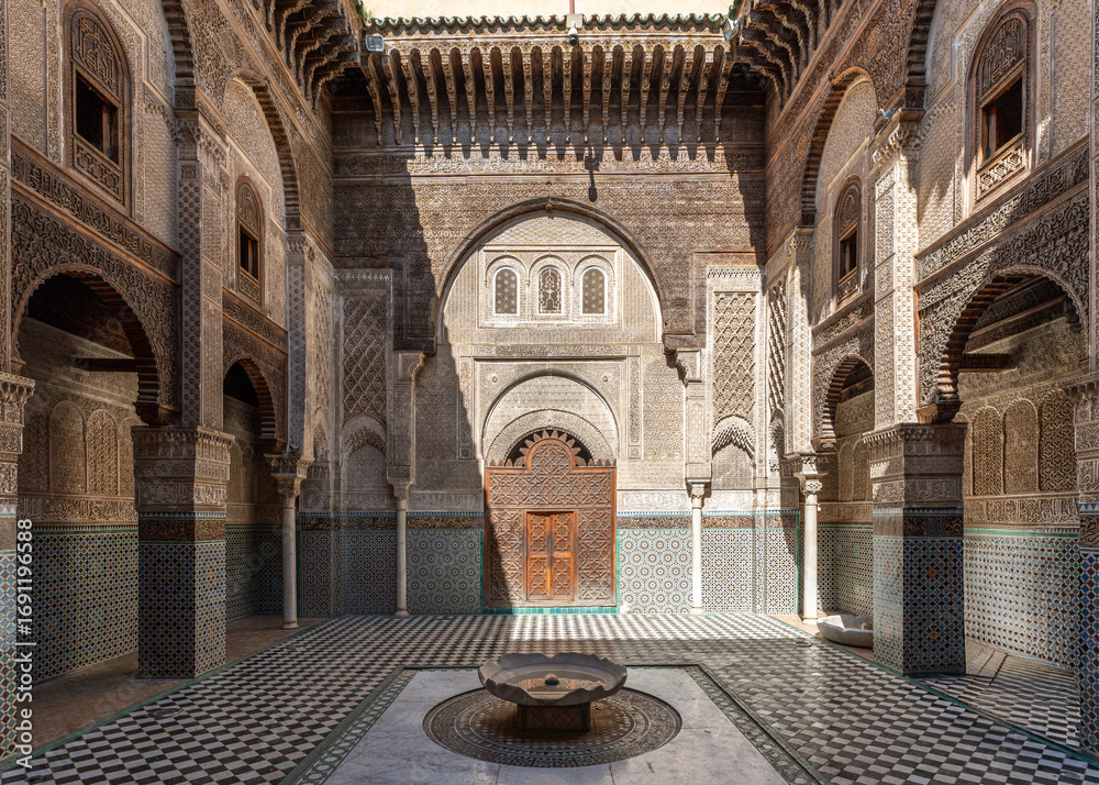 • Courtyard of Al-Attarine Madrasa, one of the most beautiful historical madrasas in Fez medina, Morocco