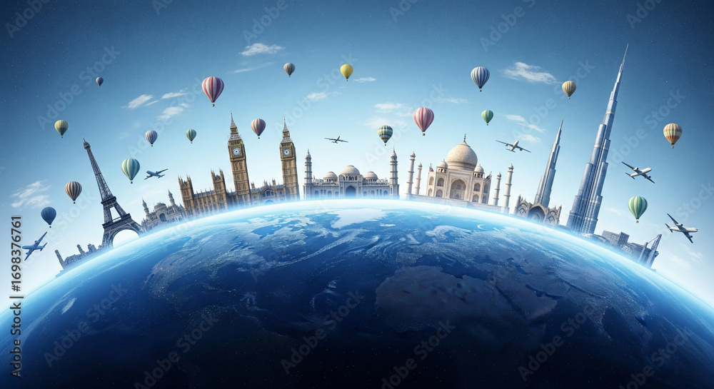 Experience the globe's most iconic landmarks from new heights, soaring above the Earth with vibrant hot air balloons and swift airplanes, inspiring dreams of global adventure and unforgettable journey od 0,00 zł Dopasuj i kup