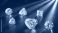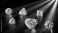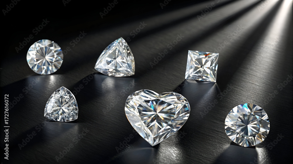 • Six diamond of the most popular cutting styles: round brilliant, asscher, princess, heart, cushion, triangle. Close-up view with shadows in spotlight on black background. 3D rendering illustration