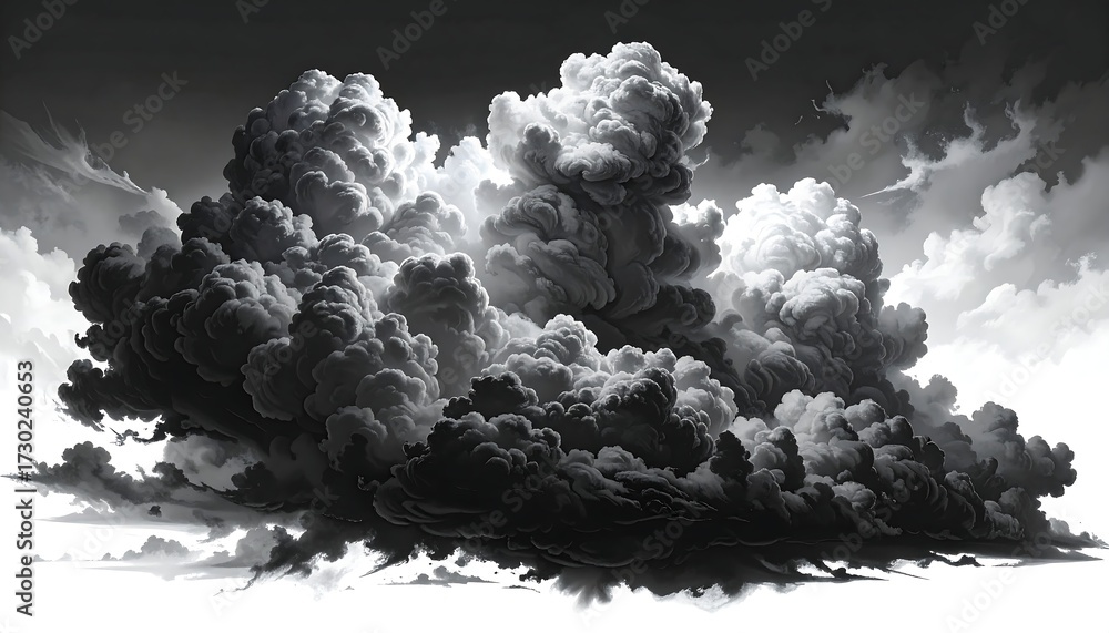 • Monochromatic depiction of a massive, cumulus cloud formation, rendered with detailed shading and texture, filling most of the frame