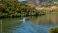 • Panorama of the Douro Valley in northern Portugal photographed from the train on a summer day. Picturesque scenery with excursion vessel. Portugal's most beautiful railway line along the riverbank.