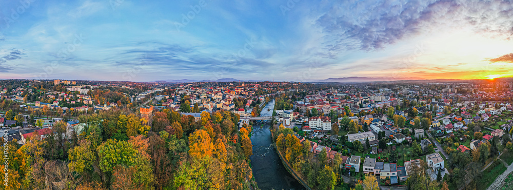 Naklejka do Sypialni - Graniczna rzeka Olza w Cieszynie z mostem łączący polski i czeski Cieszyn. Panorama wieczorem. #1763968043