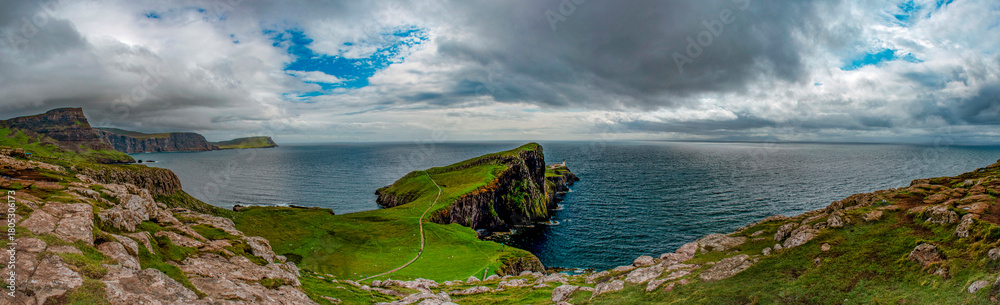 Naklejka do Sypialni - Scotland, United Kingdom: aerial view of the sheer cliff of Neist Point lighthouse (1909), famous... #1805306173
