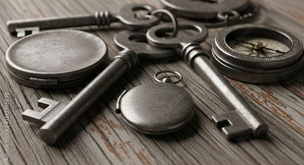 • Several old-fashioned metal keys are the most prominent items.They have long shafts and ornate heads, typical of antique or skeleton keys.
