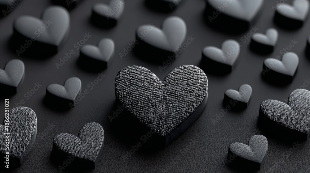 • A black and white photo of hearts in various sizes and shapes. The heart in the center is the largest and most prominent. The photo has a moody and mysterious feel to it, as the hearts are all black