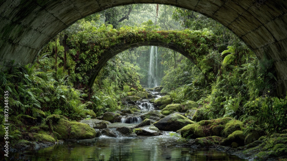 a bridge towards the most beautiful raw nature, view from inside the bridge, on the other side paradise nature with waterfall, streams