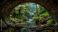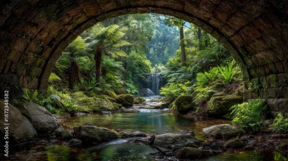 • a bridge towards the most beautiful raw nature, view from inside the bridge, on the other side paradise nature with waterfall, streams