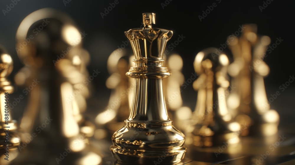 • A golden chess piece is the center of attention in a group of other chess pieces. Concept of importance and power, as the king is the most significant piece in the game
