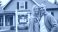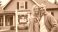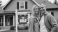 • A happy, smiling married couple, a man and a woman, standing in front of a sold house with a "Sold" sign. Real estate sales as a way to earn money and as one of the most profitable businesses.