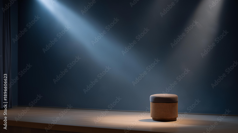 An empty stage with a single spotlight shining down on a forgotten prop, symbolizing the unspoken fear of stage that haunts even the most seasoned performers with anxiety. cinematic color od 0,00 zł Dopasuj i kup