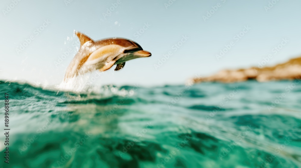 • A playful dolphin leaps gracefully out of the vibrant sea, showcasing the beauty of marine life and the joy found in nature's most captivating moments.