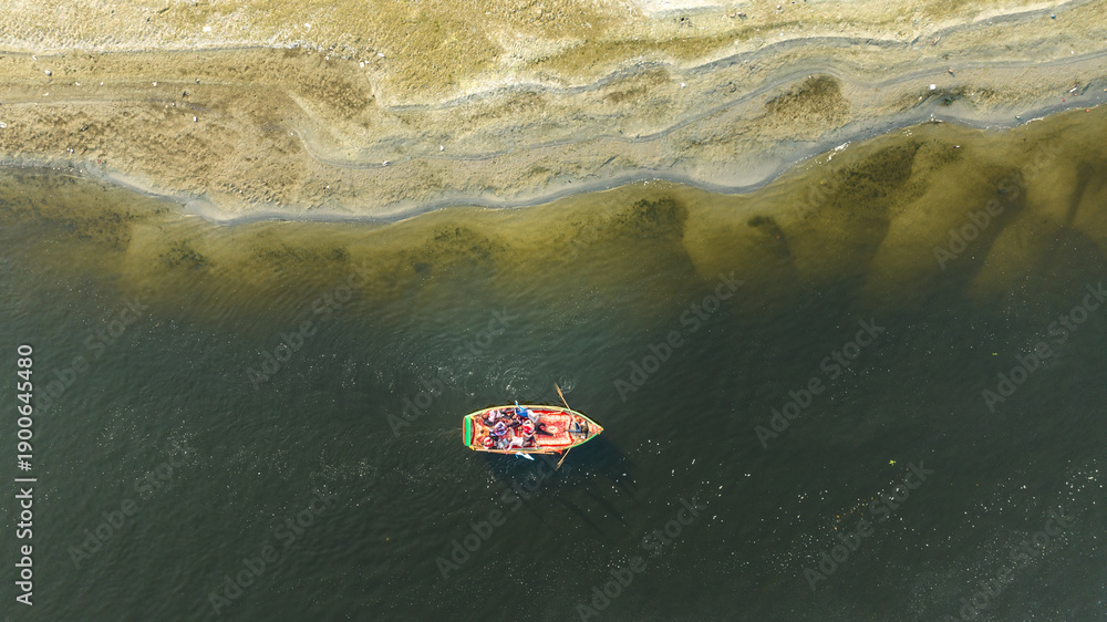 Aerial drone view of the Yamuna River flowing through Mathura, showcasing calm waters, riverbanks, and the sacred landscape of one of India’s most important spiritual cities. od 0,00 zł Dopasuj i kup Obraz