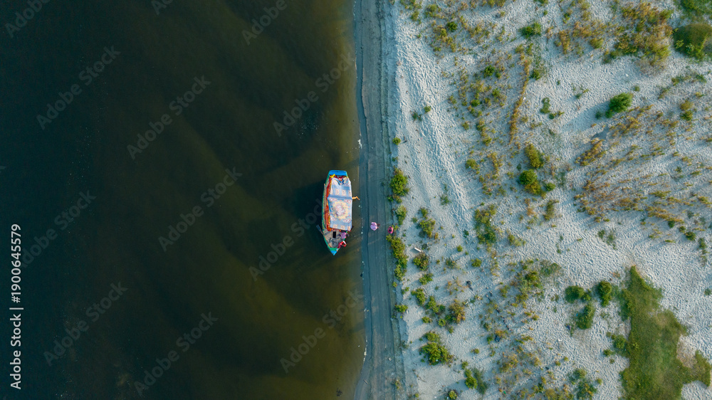 Naklejka do Sypialni - Aerial drone view of the Yamuna River flowing through Mathura, showcasing calm waters,... #1900645579