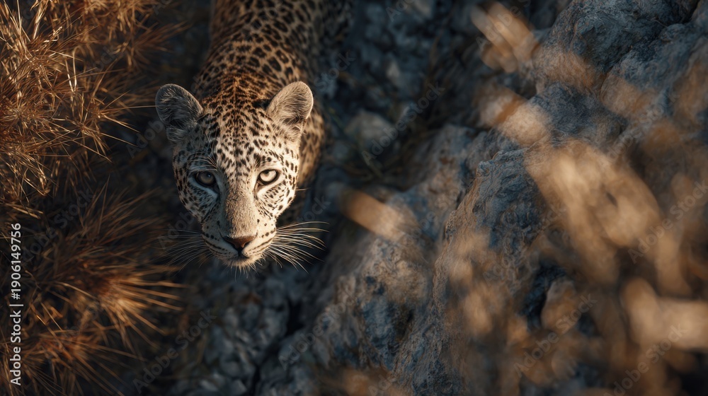 • slightly elevated cinematic top view of a rocky cliffside, a leopard standing very close to the camera, occupying most of the frame
