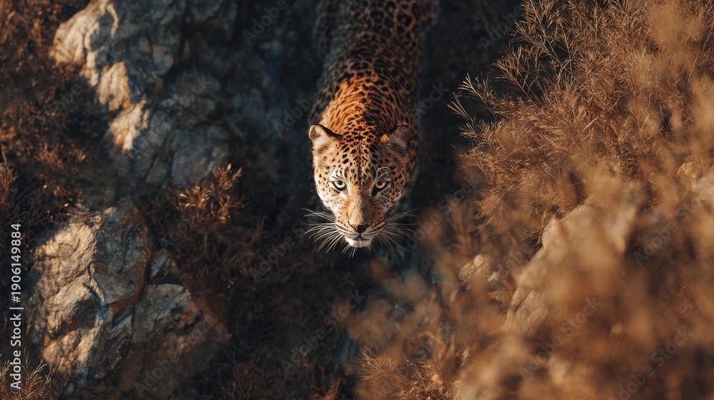 • slightly elevated cinematic top view of a rocky cliffside, a leopard standing very close to the camera, occupying most of the frame