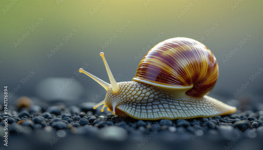 Naklejka do Sypialni - A close-up of a snail slowly crawling across a surface strewn with small dark pebbles. The snail... #1947176894