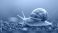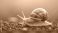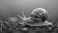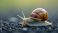 • A close-up of a snail slowly crawling across a surface strewn with small dark pebbles. The snail is centered in the frame, its body taking up most of the image.