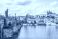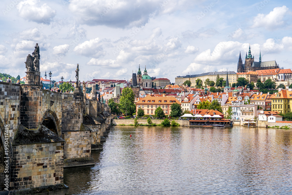 • Panoramic view of Prague historic Mala Strana district, Prague Castle, the Vltava River and Charles Bridge in summer under a blue sky with white clouds, Prague, Czech Republic